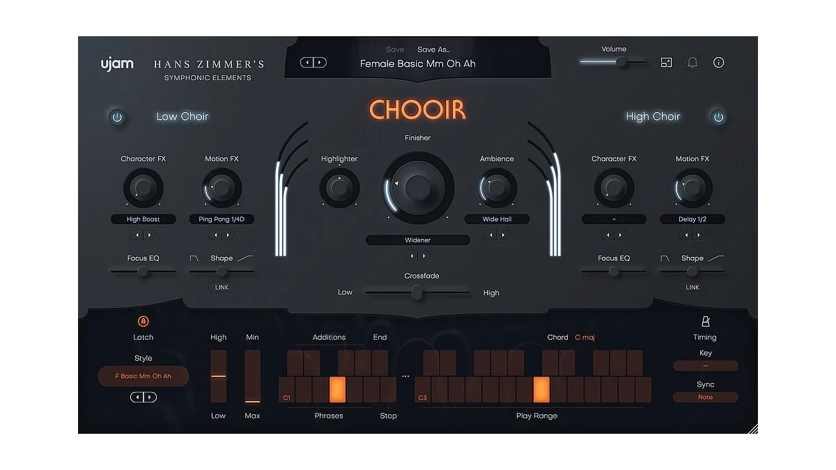 Die Library ist in zwei Sektionen für hohe und tiefe Chöre geteilt. Diese lassen sich unabhängig voneinander mit Effekten für Charakter und Motion sowie einem Focus EQ bearbeiten. Der globale Feinschliff findet in der mittig angebrachten Finisher-Sektion statt – dem Signature-Effekt von Ujam. Finisher ist ein One-Knob-Tool mit verschiedenen Modi. Abhängig von dieser Selektion werden dann entsprechende Effektketten im Hintergrund ausgelöst.