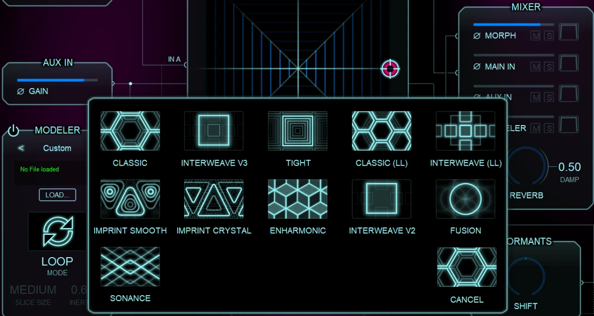 - Enharmonic: Morphing auf Basis harmonischer Anteile mit der Möglichkeit, Anteile des Originalsignals durchsickern zu lassen.